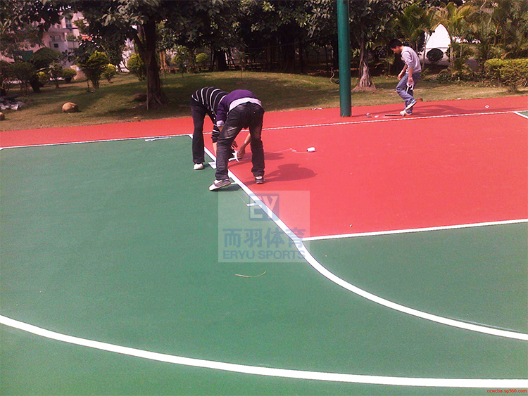 二、硅PU球场材料施工流程 (1)整体场地基础的处理、清扫 伸缩缝处理工艺:先沿着伸缩缝左右等距离把伸缩缝切成凹型口,用专用单组份的防水底涂涂刷于温度缝内和两侧,再把弹性层材料灌于温度缝内,最好的效果是填完后比 (2)底涂封底施工 (3)弹性层材料施工 施工当中不用添加稀释剂二甲苯(易燃、易爆化学危险品),这样既可以做到运输、现场施工人员的安全性,同时也可以提高材料的环保性和节省成本还不影响施工人员在施工过程中施工流平效果和质量。 弹性层材料施工前应仔细检查确认基础处理完妥才能进行弹性层施工,施工时将弹性胶、水倒入桶内高速搅拌均匀,直接用胶板分层涂刮于基面上(施工时应计算好要铺装的材料量,搅拌好的材料应迅速铺装完毕,否则会固化浪费材料),每层涂刮时间间隔为前一层干固为准(具体干固时间视现场天气情况而定),每层涂刮的厚度建议为2毫米左右,直至涂刮到要求厚度。涂刮时注意流平效果,以保证表面平整,应避免在烈日和高温下施工,弹性层干固后用积水法测试表面平整度。